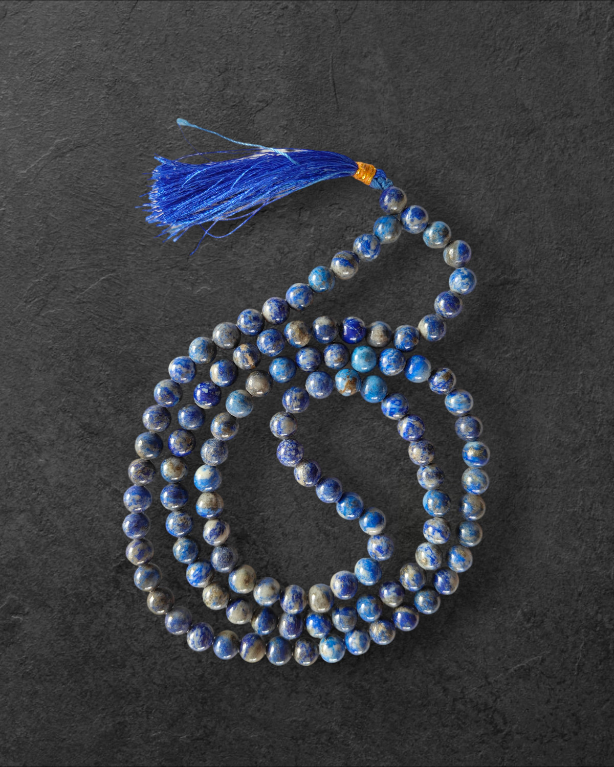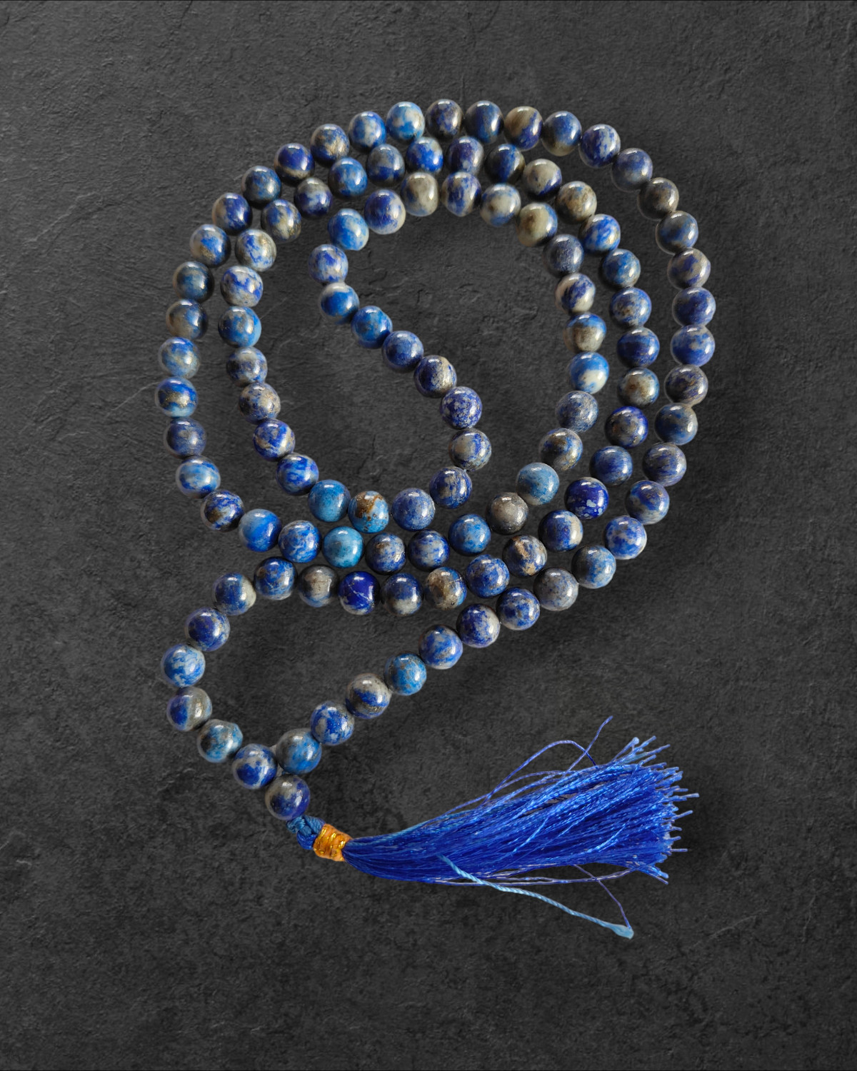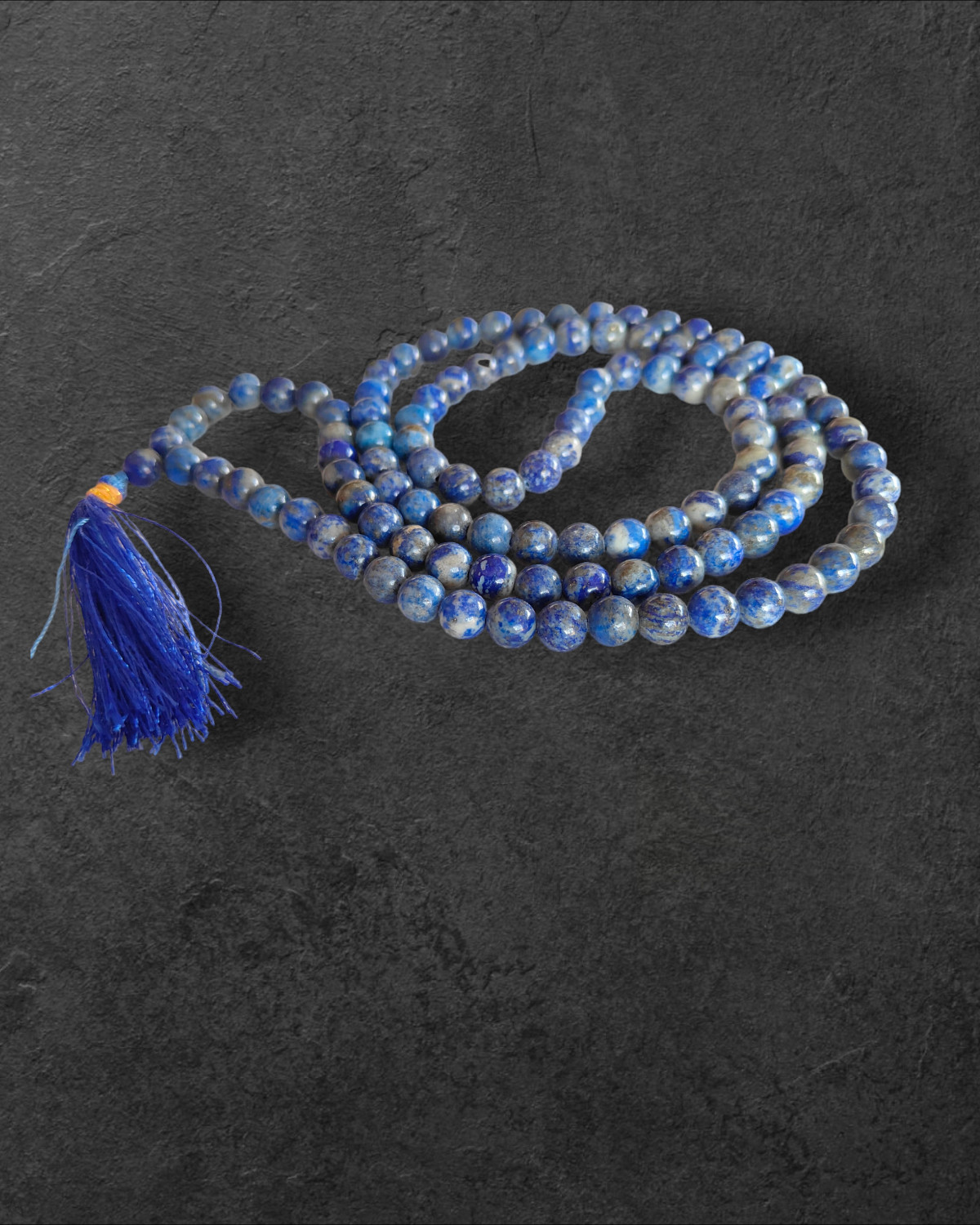 Embark on a journey of wisdom and truth with our Lapis Lazuli Mala, a symbol of inner vision, self-expression, and spiritual enlightenment. Lapis Lazuli, with its deep blue colour flecked with golden pyrite, is revered for its metaphysical properties and astrological significance. This majestic stone resonates with the throat and third eye chakras, enhancing communication, intuition, and spiritual insight. Dive deep into the cosmic energy of Lapis Lazuli and awaken your inner wisdom and divine truth.