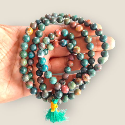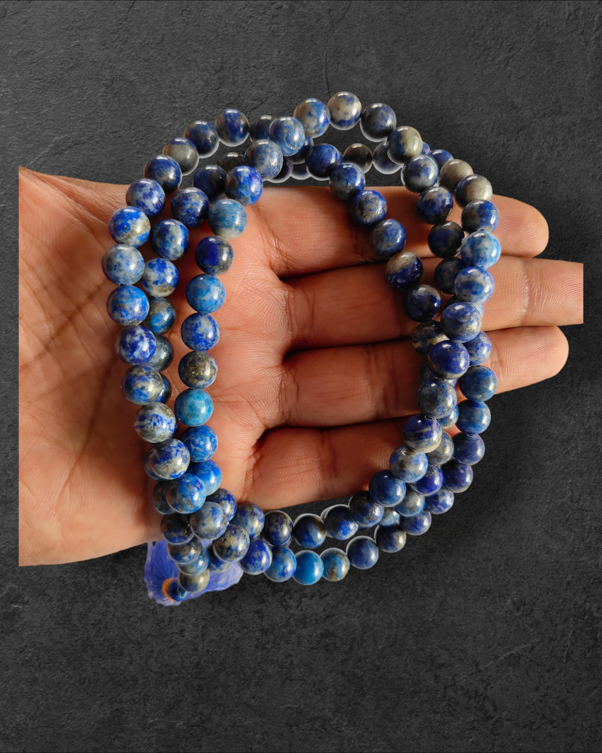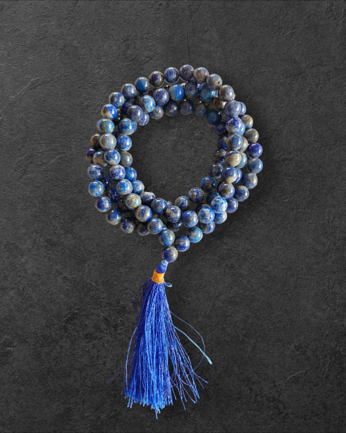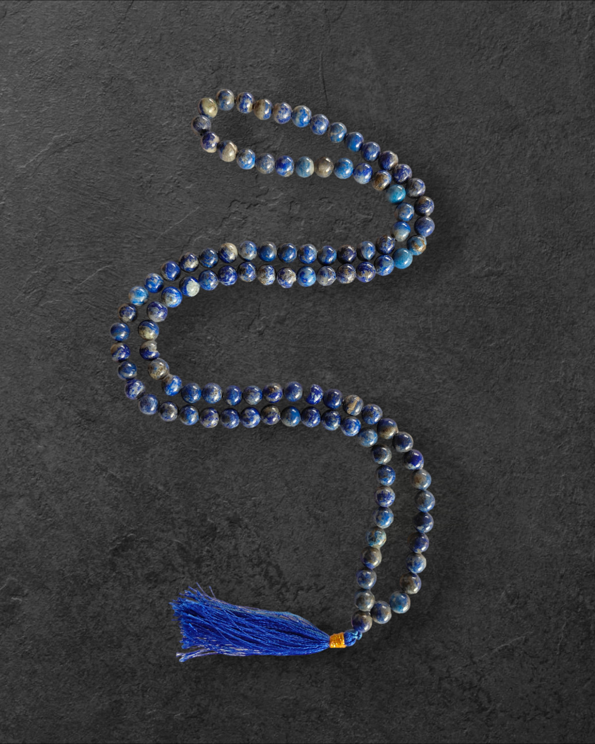 Embark on a journey of wisdom and truth with our Lapis Lazuli Mala, a symbol of inner vision, self-expression, and spiritual enlightenment. Lapis Lazuli, with its deep blue colour flecked with golden pyrite, is revered for its metaphysical properties and astrological significance. This majestic stone resonates with the throat and third eye chakras, enhancing communication, intuition, and spiritual insight. Dive deep into the cosmic energy of Lapis Lazuli and awaken your inner wisdom and divine truth.